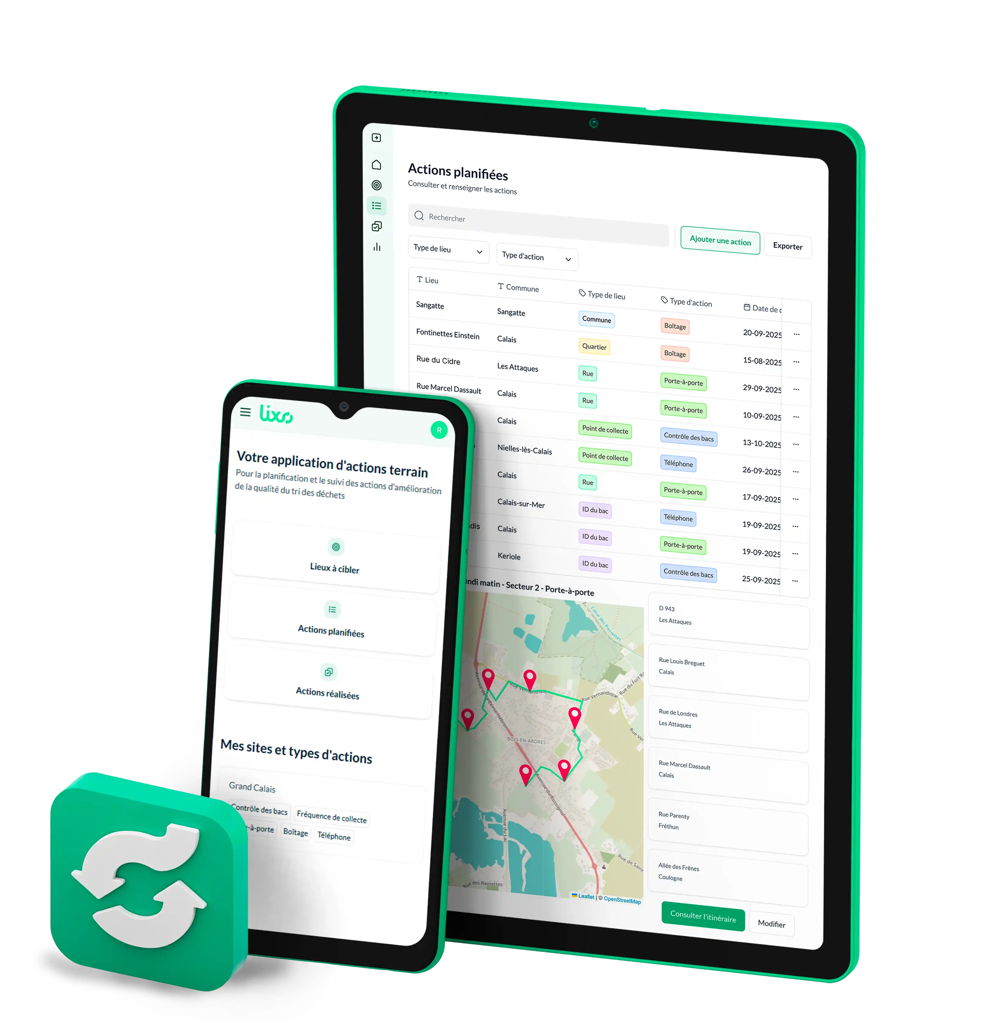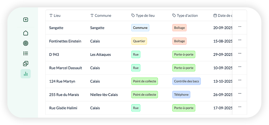 Générez un plan d'actions adapté à votre territoire grâce aux données Lixo et améliorez la qualité du tri. La nouvelle application terrain permet de planifier, suivre et déclencher des actions correctives. Collectez des déchets, des données et agissez auprès de vos usagers.